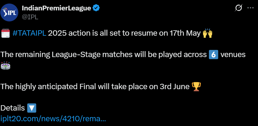 ଭାରତ-ପାକିସ୍ତାନ ମଧ୍ୟର ଉତ୍ତେଜନା ଯୋଗୁଁ ଆଇପିଏଲକୁ ସ୍ଥଗିତ ରଖାଯାଇଥିଲା। ଧର୍ମଶାଳାରେ କିଙ୍ଗସ୍ ଇଲେଭେନ୍ ପଞ୍ଜାବ ଓ ଦିଲ୍ଲୀ କ୍ୟାପିଟାଲ୍ସ ମଧ୍ୟରେ ଖେଳାଯାଉଥିବା ମ୍ୟାଚ୍ ସୁରକ୍ଷା କାରଣରୁ ମଝିରେ ବନ୍ଦ ହୋଇଯାଇଥିଲା । ତେବେ ଗତ ଶନିବାର ଦିନ ଉଭୟ ଦେଶ ମଧ୍ୟରେ ଯୁଦ୍ଧବିରତି ଘୋଷଣା ପରେ ବିସିସିଆଇ ଟୁର୍ଣ୍ଣାମେଣ୍ଟକୁ ପୁନଃ ଆରମ୍ଭ କରିବା ପାଇଁ ଯୋଜନା କରିଛି। ପ୍ଲେଅଫ୍ ପର୍ଯ୍ୟାୟ ମେ ୨୦ ରୁ ଆରମ୍ଭ ହେବାର ଥିଲା, ଏବେ ଏହା ନୂତନ କାର୍ଯ୍ୟସୂଚୀ ଅନୁଯାୟୀ ମେ ୨୯ ରୁ ଆରମ୍ଭ ହେବ। ପ୍ରଥମ କ୍ୱାଲିଫାୟର ମ୍ୟାଚ୍ ମେ ୨୯ରେ ଖେଳାଯିବ। ଏଲିମିନେଟର ମ୍ୟାଚ୍ ମେ ୩୦ରେ, ଦ୍ୱିତୀୟ କ୍ୱାଲିଫାୟର ମ୍ୟାଚ୍ ଜୁନ୍ ୧ରେ ଏବଂ ଫାଇନାଲ ମ୍ୟାଚ୍ ଜୁନ୍ ୩ ରେ ଖେଳାଯିବ। ପ୍ଲେଅଫ୍ ମ୍ୟାଚ୍ ପାଇଁ ସ୍ଥାନ ଖୁବଶୀଘ୍ର ଘୋଷଣା କରାଯିବ। କୋଲକାତାର ଇଡେନ୍ ଗାର୍ଡେନ୍ସରେ ଫାଇନାଲ ମ୍ୟାଚ୍ ହେବାର ଯୋଜନା ଥିଲେ ମଧ୍ୟ, ଜୁନ୍ ପ୍ରଥମ ସପ୍ତାହରେ ବର୍ଷାର ସମ୍ଭାବନା ଯୋଗୁଁ ଏହା ବଦଳାଯାଇ ଯାଇପାରେ ବୋଲି ଆଶା କରାଯାଉଛି। ବିସିସିଆଇ ସମସ୍ତ ଫ୍ରାଞ୍ଚାଇଜିକୁ ମେ ୧୩ ସୁଦ୍ଧା ସେମାନଙ୍କ ଖେଳାଳି ଓ ସହାୟକ କର୍ମଚାରୀଙ୍କୁ ଏକତ୍ର କରିବାକୁ ନିର୍ଦ୍ଦେଶ ଦେଇଛି।